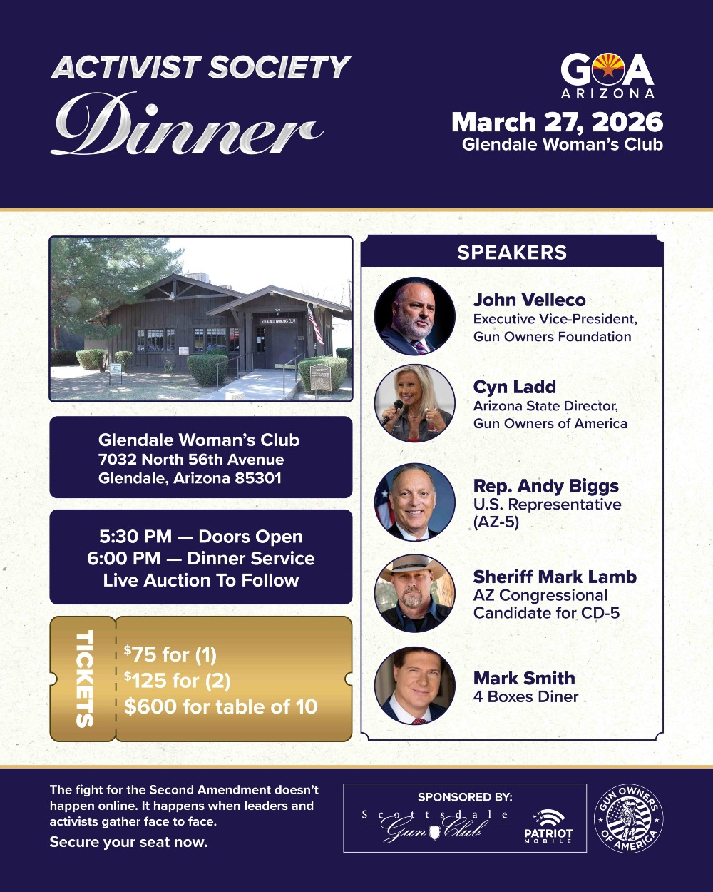 Join us for an unforgettable evening in defense of freedom at the Activist Society Dinner, a premier fundraising event supporting Gun Owners of America and our unwavering, no-compromise mission to protect and restore the Second Amendment.