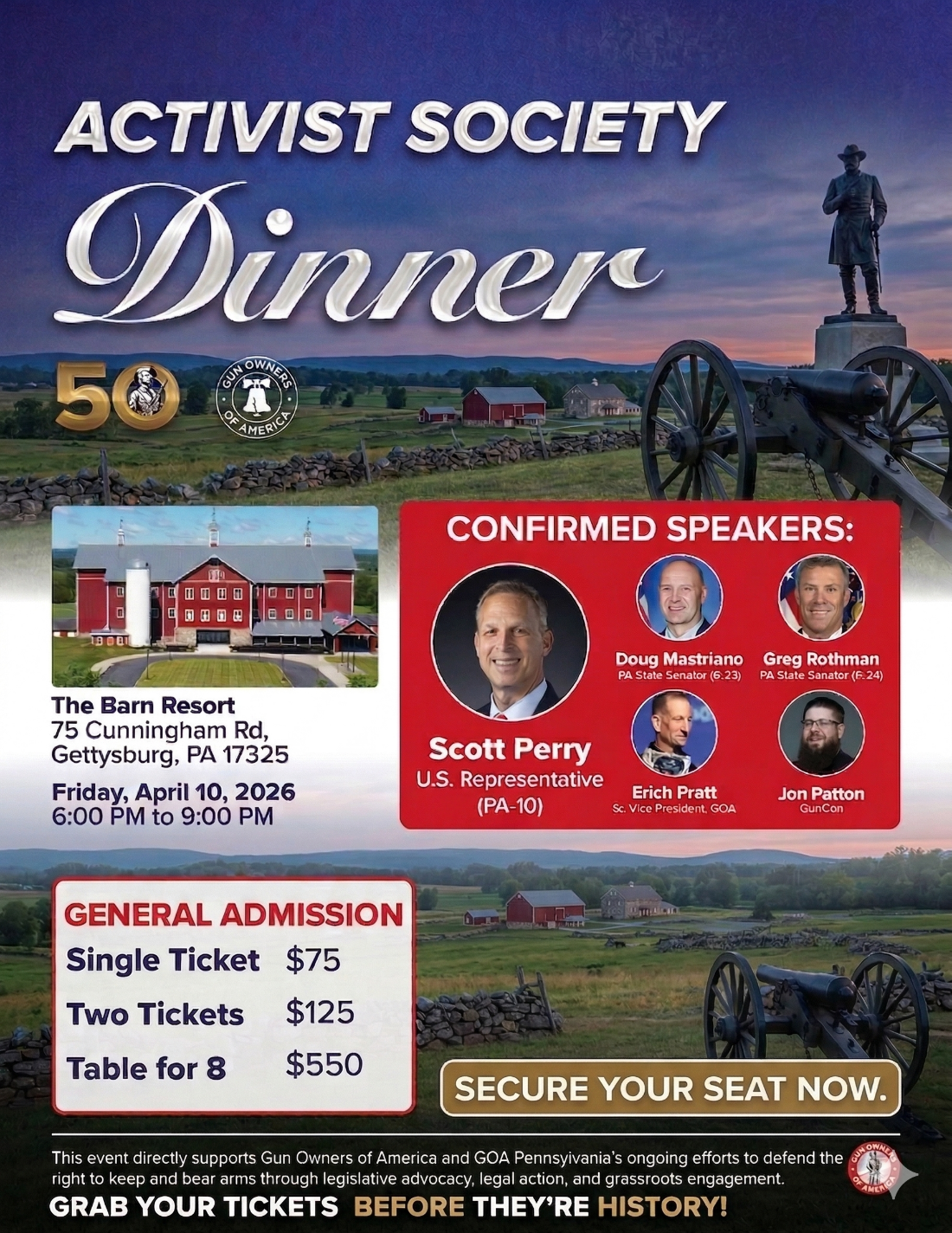 Join Gun Owners of America Pennsylvania for a night of fellowship, freedom, and frontline Second Amendment advocacy at the historic Barn Resort in Gettysburg, one of the most fitting backdrops imaginable for a gathering of patriots committed to protecting our rights.